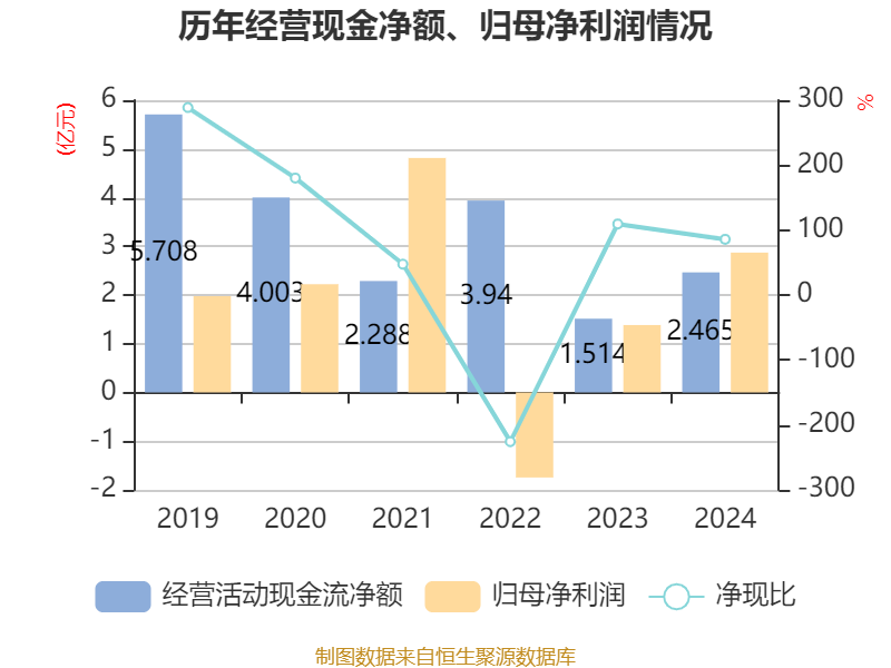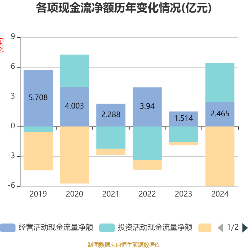 截至2024年,公司经营活动现金流净额为2.46亿元,同比增长62.76%;筹资活动现金流净额-5.99亿元,同比减少5.7亿元;投资活动现金流净额3.95亿元,上年同期为-1.59亿元。
