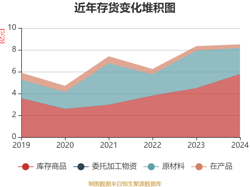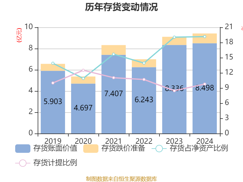 从存货变动来看,截至2024年末,公司存货账面价值为8.5亿元,占净资产的19.16%,较上年末增加1616.8万元。其中,存货跌价准备为9197.98万元,计提比例为9.77%。