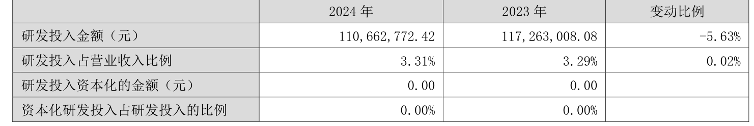 2024年全年,公司研发投入金额为1.11亿元,同比下降5.63%;研发投入占营业收入比例为3.31%,相比上年同期上升0.02个百分点。此外,公司全年研发投入资本化率为0%。